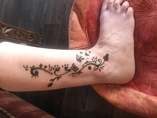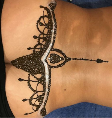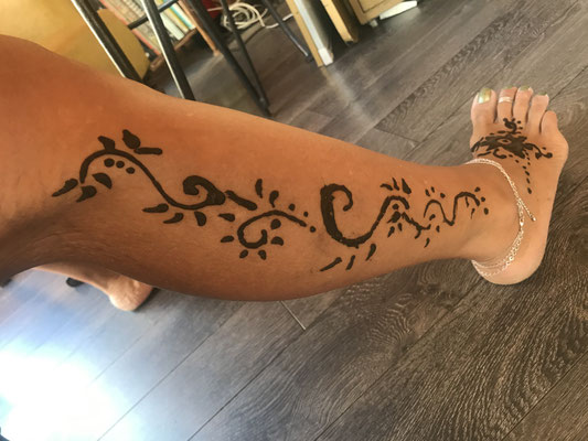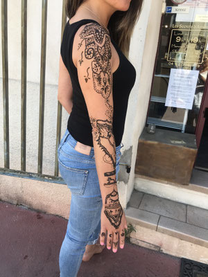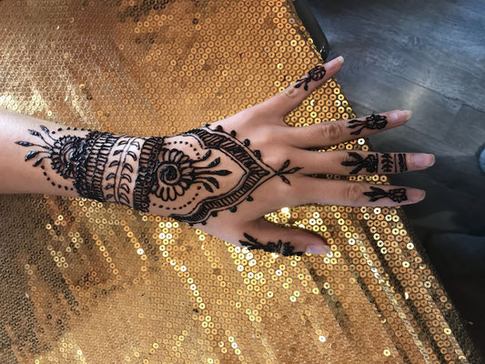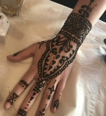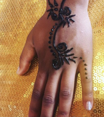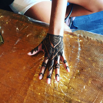Tatouage au henné de motifs personnels ou proposés, avec du henné naturel. Compter 30 à 60€ pour un travail simple sur la main. Compter 1€ la minute.